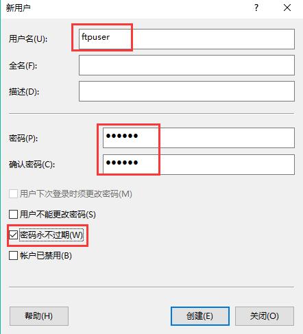 2. 輸入用戶名,自己隨便取,比如ftpuser,接著輸入密碼及確認密碼,去掉“用戶下次登錄時須更改密碼”的勾,選擇“密碼永不過期”,創建。