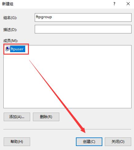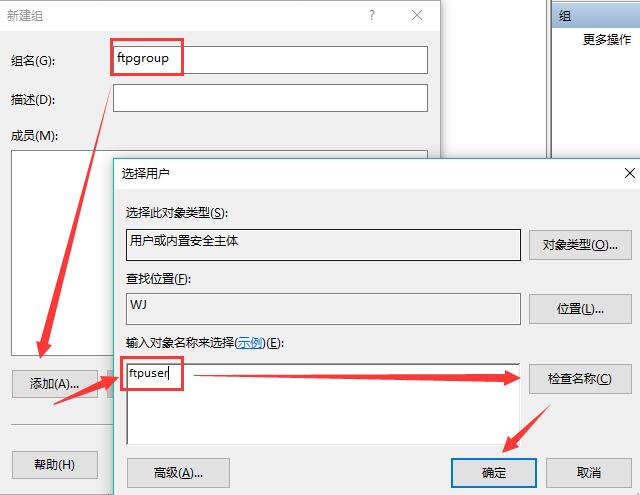 4. 取個組名,比如ftpgroup,之后選添加成員,把之前創建的ftpuser添加進來,選檢查名稱,之后確定。