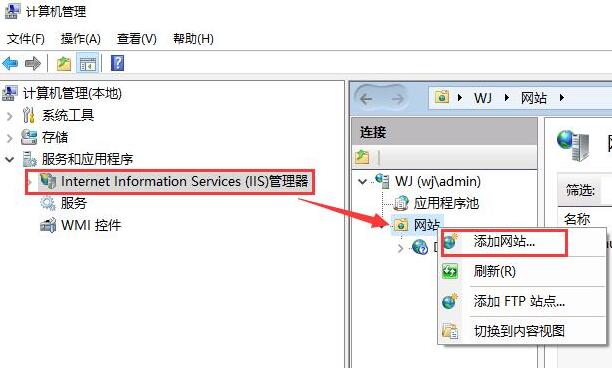 1. 右鍵我的電腦,管理→服務和應用程序→IIS管理器,進入IIS設置,右鍵點擊網站→添加網站