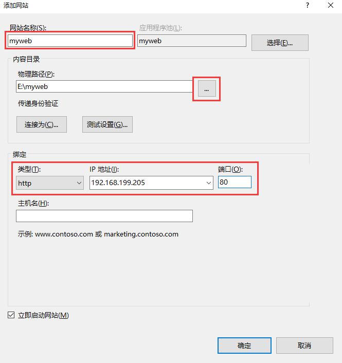 2. 給網站起個名字,比如myweb,選擇物理路徑(你需要存放資源的文件夾),綁定類型默認為http,在IP地址欄點擊下拉框后,系統會給出一個IP地址,選擇即可(每個人IP都不一樣,我的由于是本機,所以IP地址為局域網192段),http端口默認80,主機名就是域名,比如www.abc.com,如有則填上,否則不填,最后點確定。
