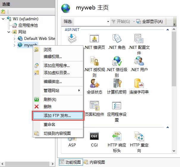 3. 右鍵點擊剛建立的網站myweb,選擇“添加FTP發布...”