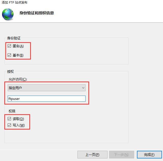5. 身份驗證勾選 “匿名和基本”,允許訪問選擇“指定用戶”,框內填第一步所建立的用戶名ftpuser,權限選擇“讀取寫入”,完成。